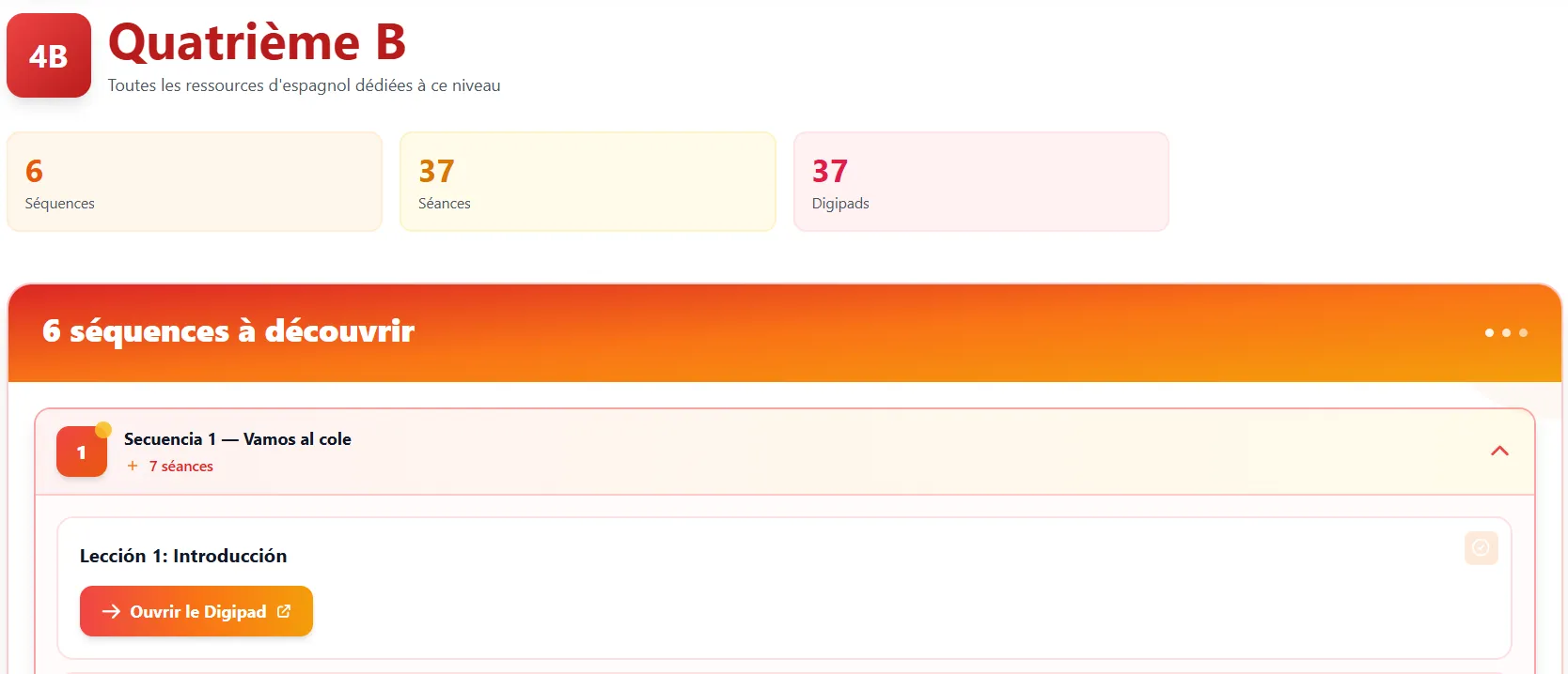 Pour chaque niveau, l’enseignant accède au module Espagnol, ouvre une séquence (accordéons) puis une séance. Chaque séance propose un bouton d’ouverture du Digipad associé dans un nouvel onglet.