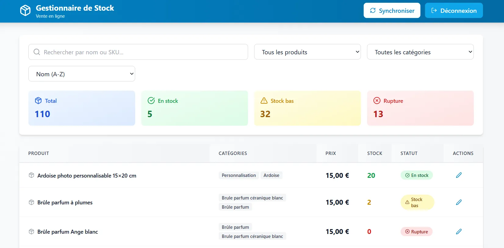 Gestion des quantités en temps réel, recherche rapide par nom ou SKU, et historique complet des mouvements (avec motif).